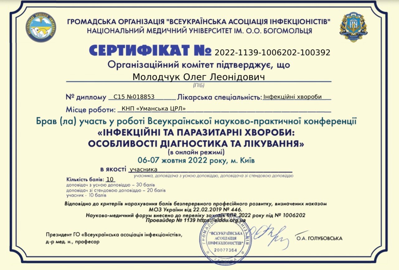 Якщо ви шукаєте кваліфікованого лікаря-інфекціоніста в Умані – запишіться на прийом до Молодчука Олега Леонідовича в клініку BeWell. Він допоможе вам знайти причину захворювання та швидко повернутись до нормального життя.