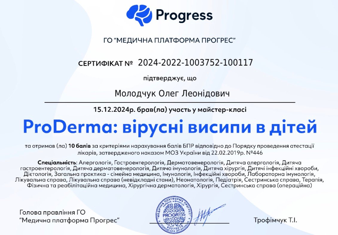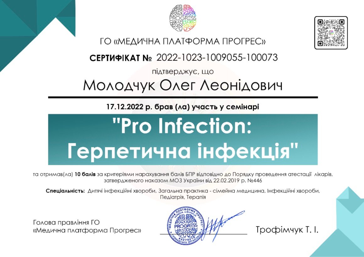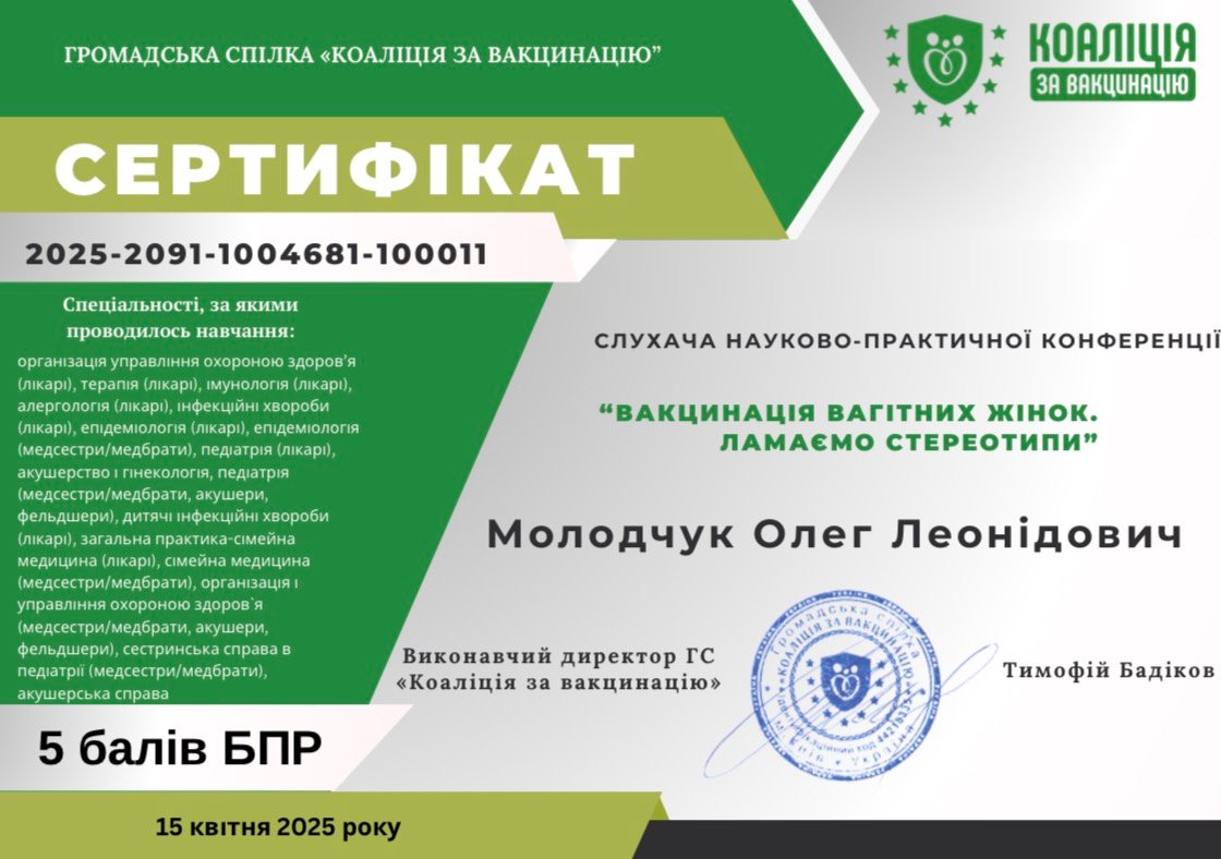 – У 2024 році отримав додаткову спеціалізацію за напрямком «Дитячі інфекційні хвороби».