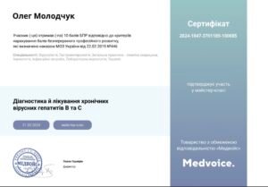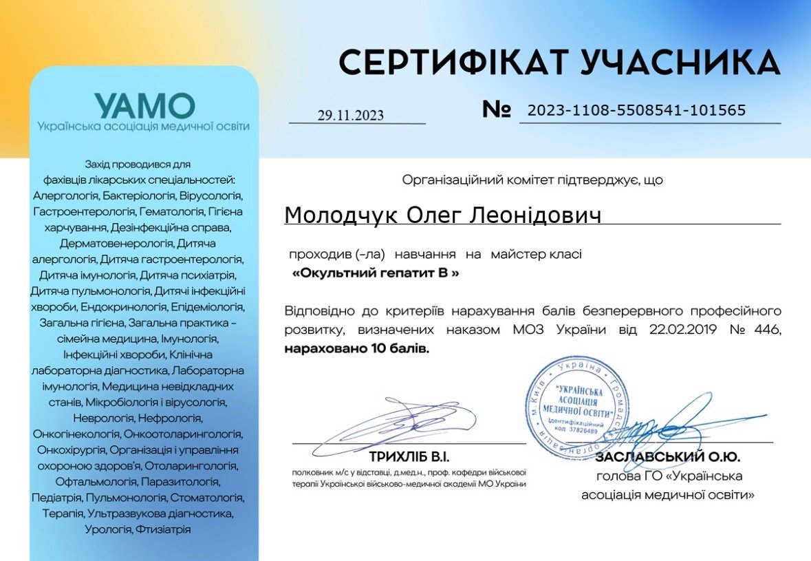 Під керівництвом Олега Леонідовича понад 150 пацієнтів досягли повного одужання від хронічного вірусного гепатиту С. Він переконаний, що пацієнт після консультації повинен залишитися з чітким розумінням стану здоров’я, причин проблеми та подальшого плану дій.