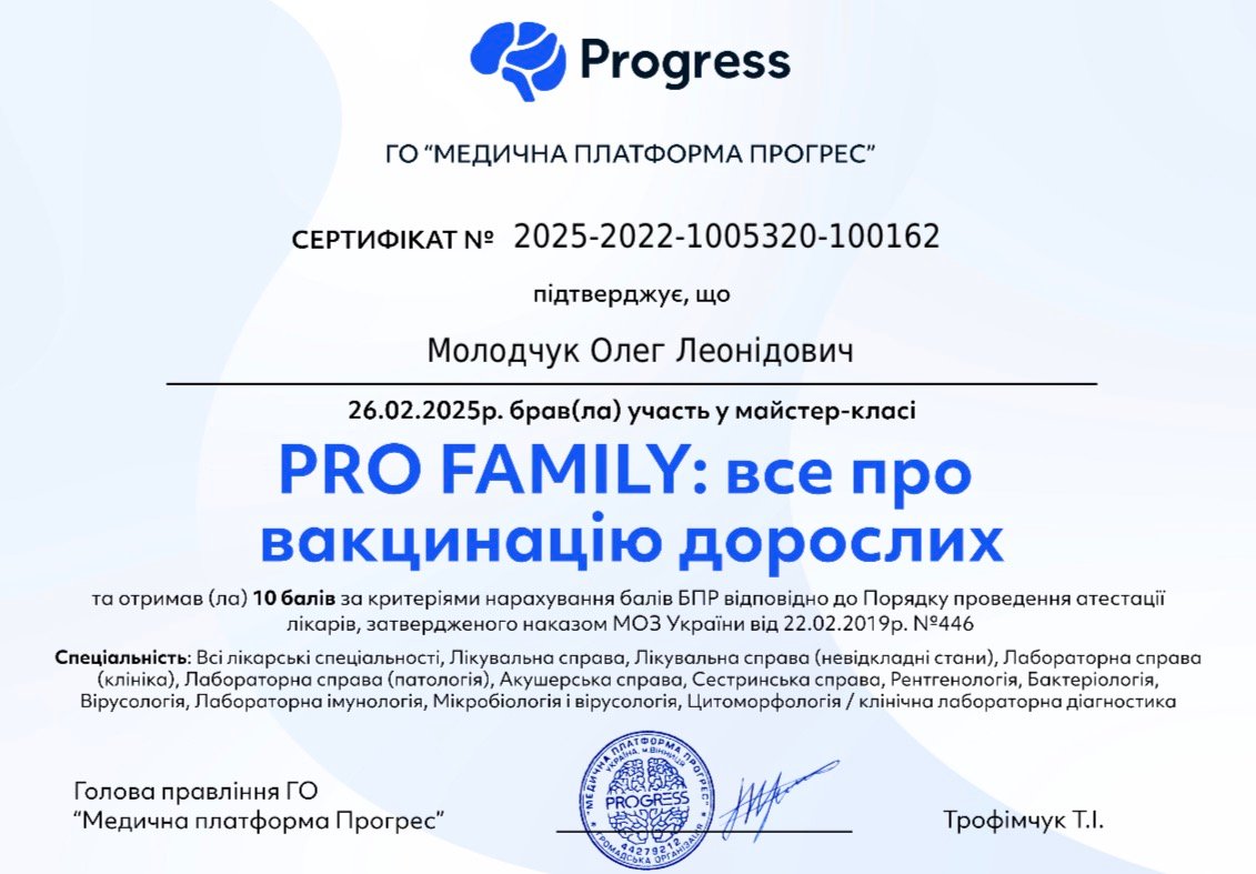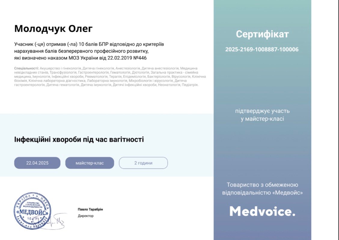 Молодчук Олег Леонідович – це лікар, який вміє простими словами пояснити складні процеси в імунній системі та надати чіткі рекомендації щодо запобігання інфекційним захворюванням. Він веде прийом у клініці BeWell в Умані, допомагаючи пацієнтам зрозуміти причину свого стану та отримати ефективне лікування – як дорослим, так і дітям.