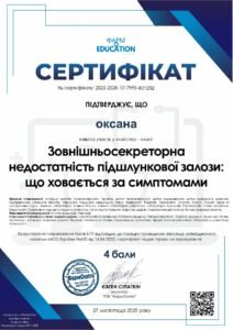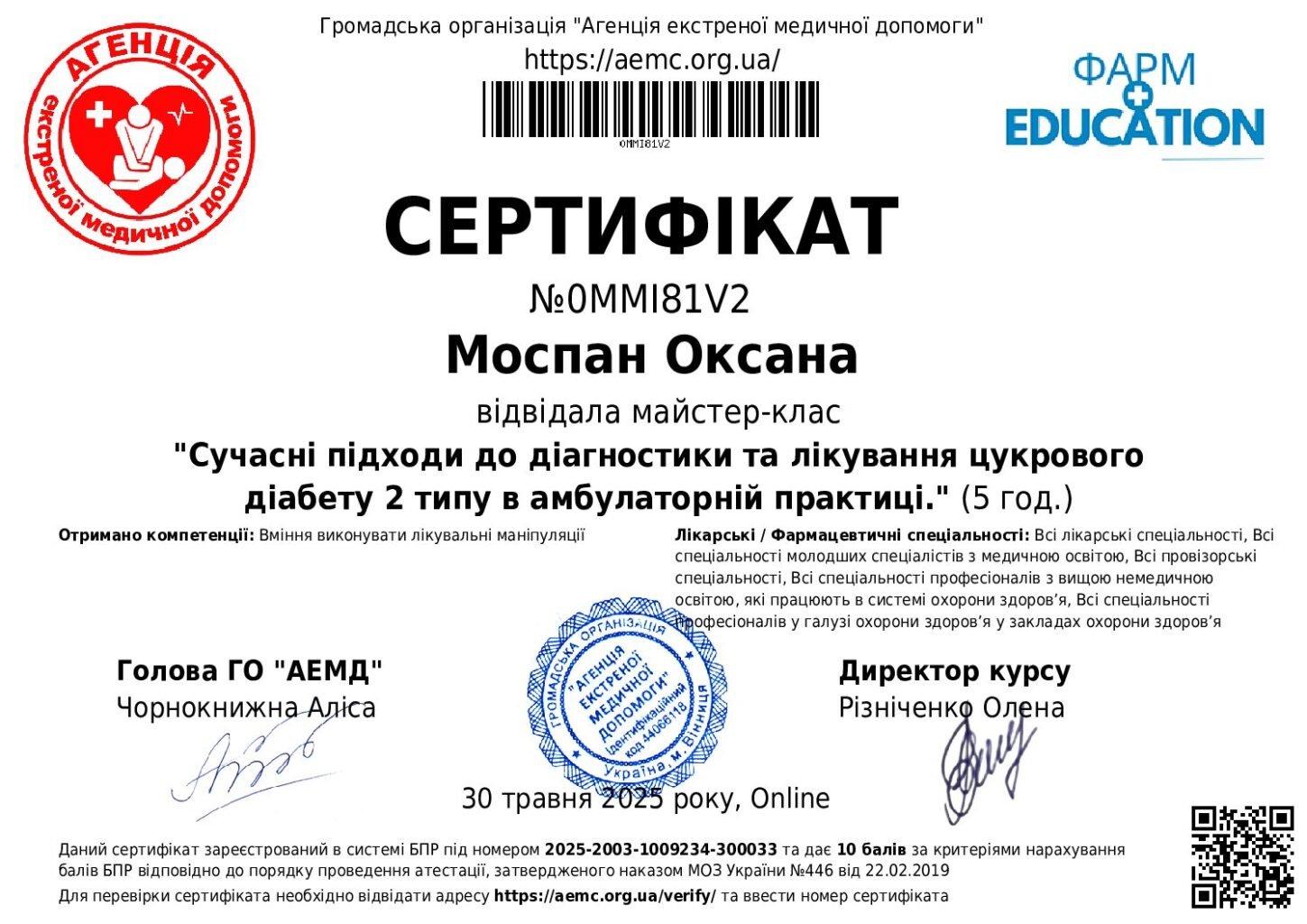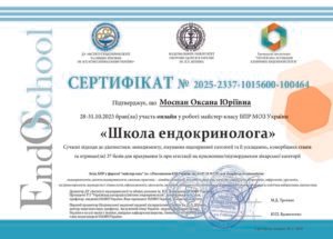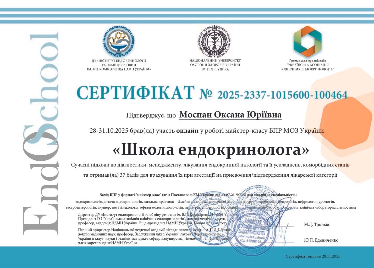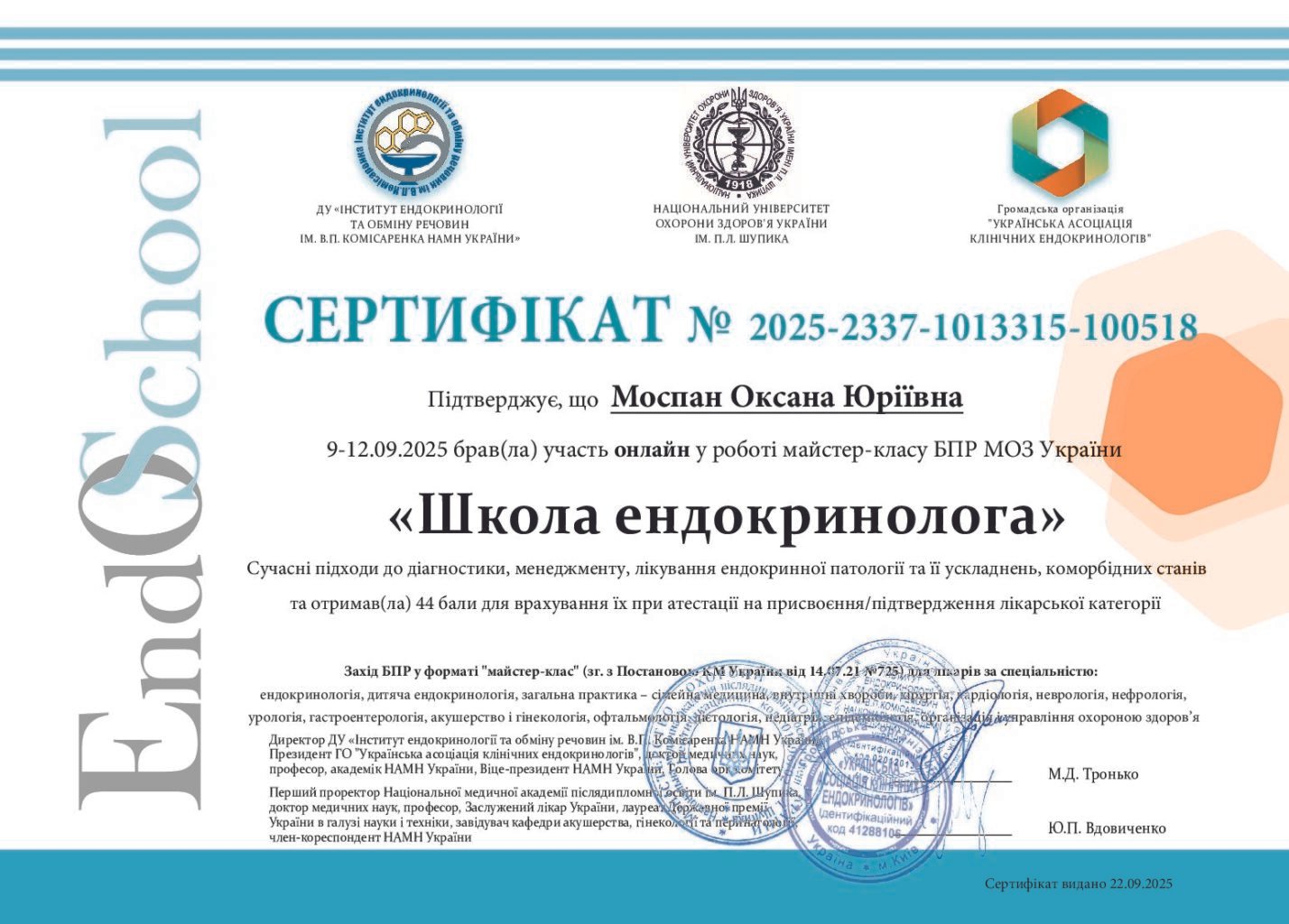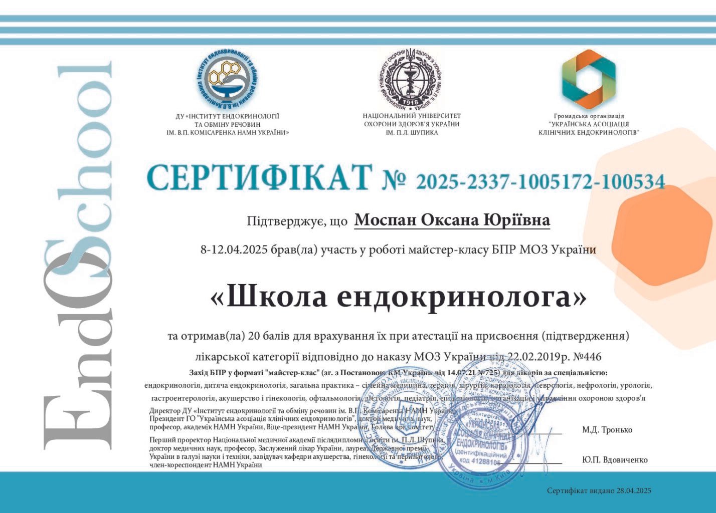 Лікар Моспан Оксана Юріївна – фахівець, до якого звертаються пацієнти з найрізноманітнішими порушеннями гормонального фону. Свою медичну освіту вона здобула у Вінницькому національному медичному університеті ім. М.І. Пирогова, а клінічну практику розпочала у 2020 році. З 2023 року працює ендокринологом і постійно вдосконалює свої знання, щоб надавати сучасну й точну допомогу.